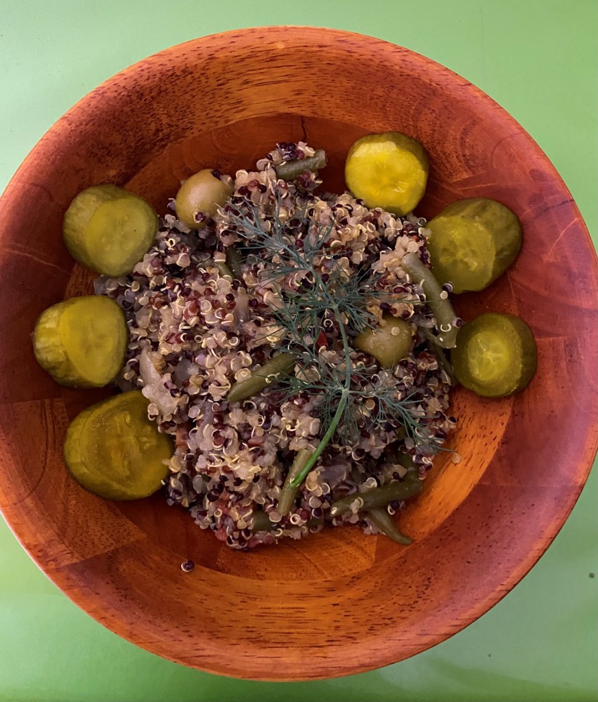 Put cooked quinoa with green beans according to recipe and serve it with cucumber that is pickled and yummy. I hope you guys will like my recipe and enjoy its health benefits.