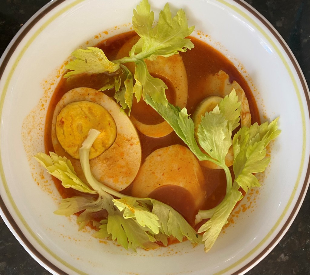 Take a deep pan and add a teaspoon of coconut oil. it’s very good and antibacterial, boosts the immune system, ginger powder, cumin powder, turmeric powder, and on the stove on low heat mix the spices and add tomato puree, then 3 cups,of water. Boil it until cooked and then add boiled eggs, cut them in half, and put them in ginger curry.It’s delicious and good for stomach. Eggs will give us the required Protein that is good for muscular system. ginger is good for coming allergy season to boost immunity level in the body. Make rice with it.