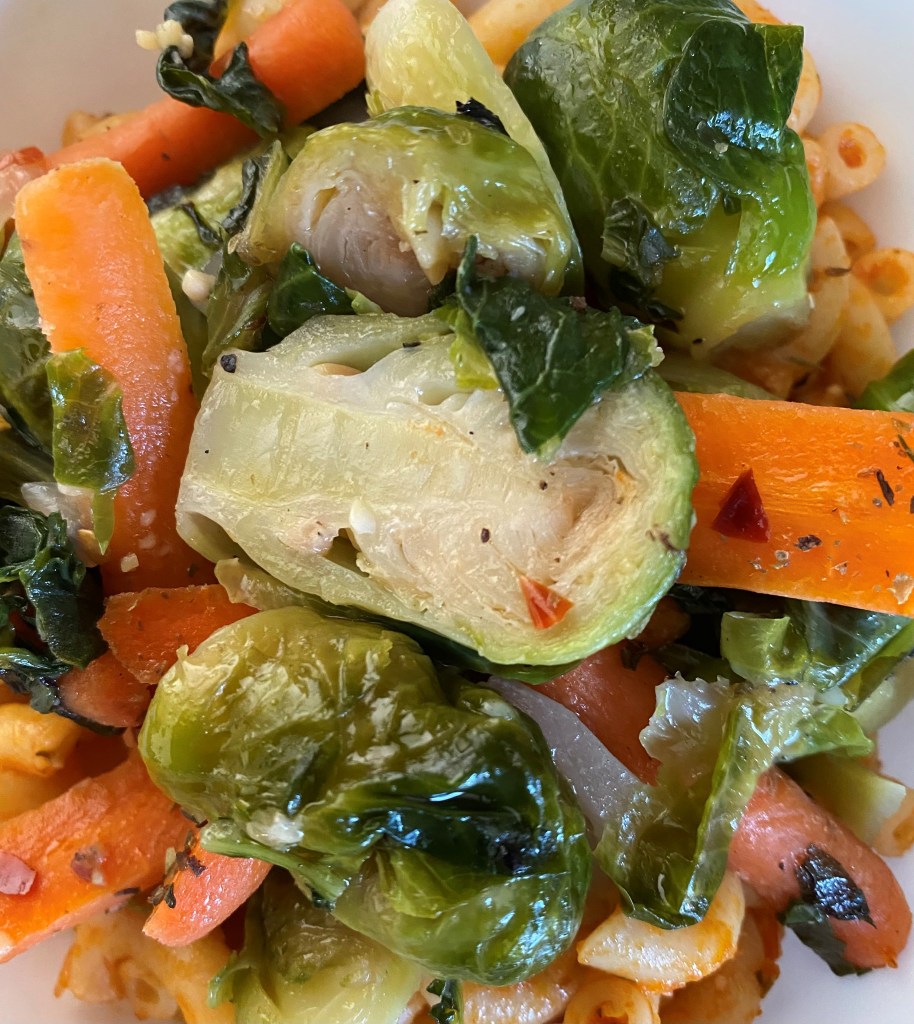 Take a frying pan and add a cup of chopped Brussel sprouts and a cup of chopped baby carrots. cook them on low heat for 10 minutes until nice and soft.