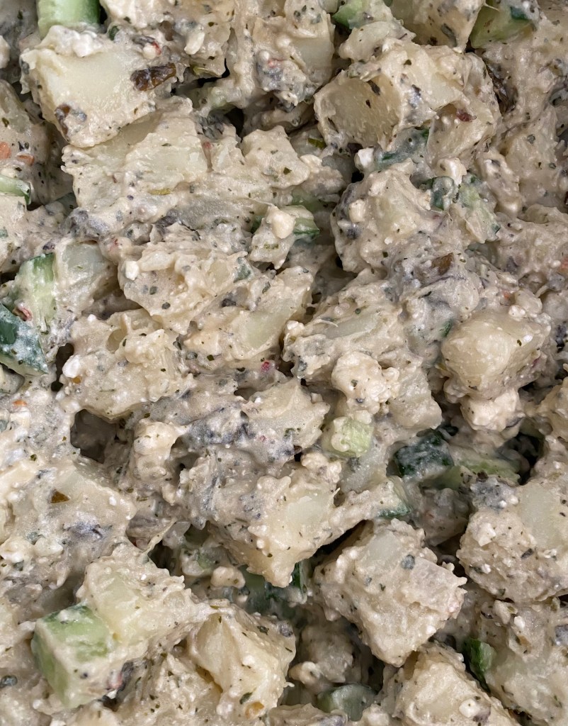 blend all the ingredients in a blender and make a very smooth pesto. then put it in a dish. we will prepare our main ingredient, nice and clean organic potatoes. we will boil 1pound of potatoes. for 30 minutes until they are soft but not fully squished. After boiling we will let them cool for 5 minutes and then peel them. after that we will cut them into cubes. now it’s time to put the salad and all the ingredients together. put all the cubed potatoes in a big bowl. then add pesto all over the potatoes and mixed it well with a wooden spoon without smashing them. cover it up for 15 minutes so all the potatoes will absorb flavor and goodness from the pesto we added. then savor it, it’s healthy, filling, and easy to make. let’s talk about how good are the ingredients we used today for digestion and full of vitamins and minerals. potatoes are a good source of fiber and keep us fuller for a long time, so help us lose weight. fiber helps to lower cholesterol and blood sugar levels in check. mint improves indigestion and cold symptoms rich in nutrients. The yogurt we use is probiotic. basil energies mind and body contain magnesium and eugenol that lowers blood pressure and lowers blood sugar full of vitamin A and K. so overall the salad with pesto we made today is very healthy and delicious. I hope you guys will try making that and enjoy it.