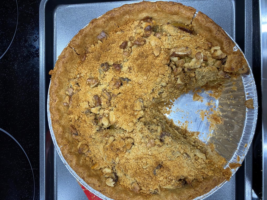 Take a bowl add sliced apples put them in a pot cook it on low heat for 15 minutes then add cinnamon and sugar and pinch of salt. mix them together and fill the pie crust with all the ingredients. Take sweet crackers and add butterin it. crumble it over the apple pie. put it in the oven for 40 minutes at 300 degree celcious. then off the heat and take the pie out. put it on the counter to cool down. Then cut in to pieces and serve it with a nice cup of coffea. its delicious. ingrdients we used are organic and healthy. sprinkle some pecans over it.