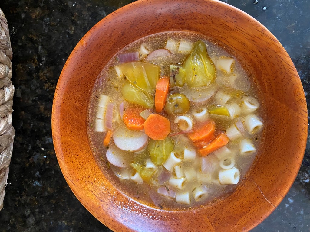 Take a pot and add two tablespoons of olive oil, then add chopped onions and cook them for 5 minutes on medium heat. Then add cherry tomatoes and finally chopped one cup of pureed tomatoes, add a teaspoon of garlic and ginger. then stir them well and cook them for 15 minutes, then add spices. salt, pepper, thyme, and rosemary, and one cup of chopped baby potatoes. Then add 6 cups of water and one cup of noodles and boil it for 20 minutes on medium heat. After 20 minutes noodles are going to be soft to eat, let it cool down first and serve It warm with a piece of bread it’s delicious and light on the stomach. veggies and herbs we add are very healthy and nutritious.