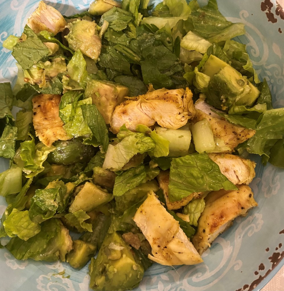 Take a big bowl, put chopped lettuce and then Avocados, and grilled chicken marinated with olive oil salt, and pepper on top. Mix them and add the dressing we made with lemon juice and salt and pepper. it looks very delicious and healthy.
