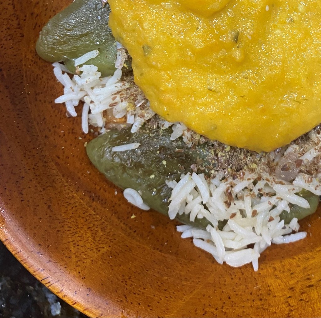 After reaching back home I decided to make a delicious meal with rice and bell peppers and Yellow Tomato puree from my Garden that I saved a few days ago. The peppers were very green and had different shapes and sizes. they are full of vitamins. I made tomato puree from yellow tomatoes and chili peppers and mint. it looks and tastes delicious and is very easy to make, full of fall flavor. By adding a dash of salt it turns out really good.
