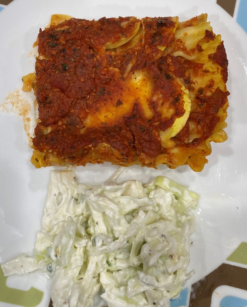 shred cabbage and whip sour cream and put salt and pepper in it. mix it well and serve it with lasagna.