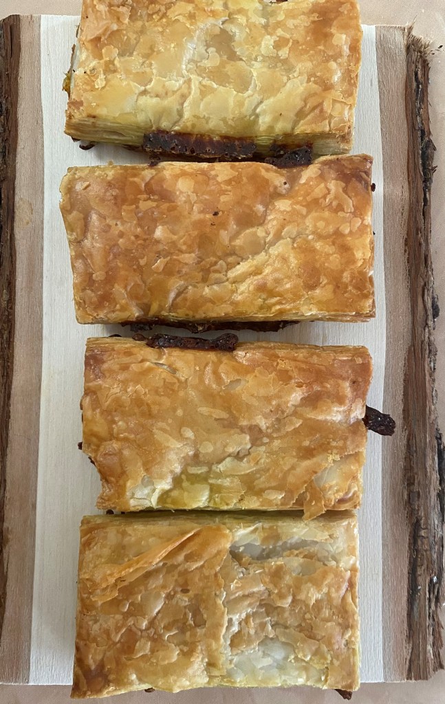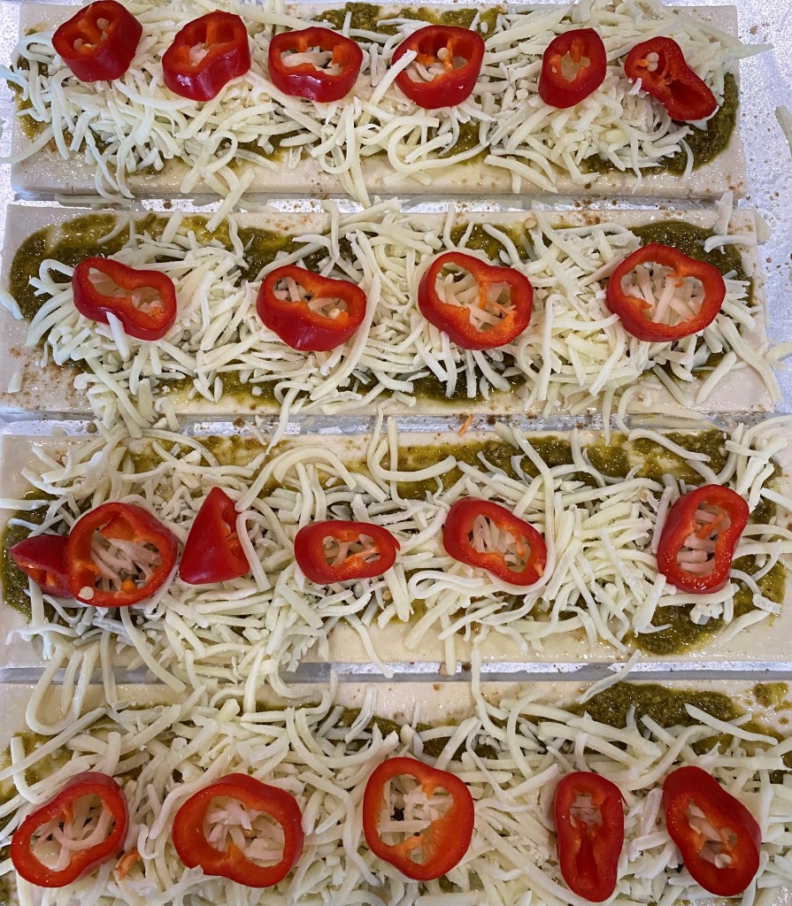 Heat the oven at 250 degrees Celsius, in the meantime take puff pastry sheets and then spread them on a sheet pan and spread pesto on it, and then add mozzarella cheese on it then put it in the oven and cook it for 15 minutes then take it out and off the oven. you can see the color of the pastry is brownish and it’s crispy and delicious to eat.
